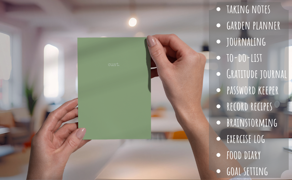 - blank and ready for anything — taking notes, making to-do-list, brainstorming, password keeper, record favourite recipes, gratitude journal, exercise log, food diary, goal setting and more